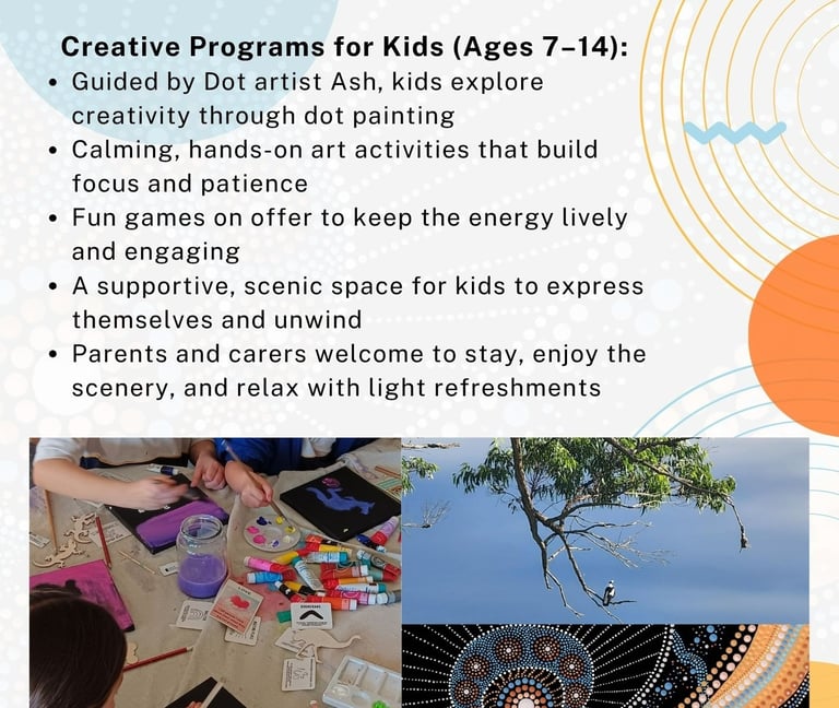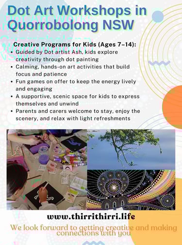 Thirri Thirri - Connecting The Dots', Artist, Ash, is offering art and self-discovery workshops. Available to schools, workplaces, and other private events. Explore how to meet your teams wellbeing needs through self-awareness in a fun, inclusive environment.