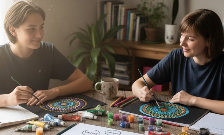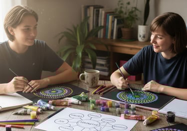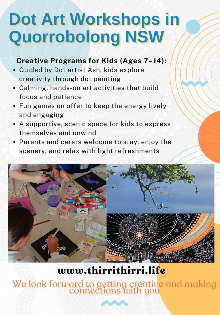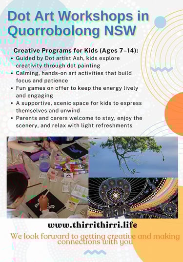 At Thirri Thirri Connecting the Dots, we believe creativity is a powerful way to slow down, make sense of our stories, and reconnect with what matters most. Our self‑discovery workshops for adults and teens blend dot art, mind mapping, and gentle reflection in a calm, scenic setting in Quorrobolong, NSW.