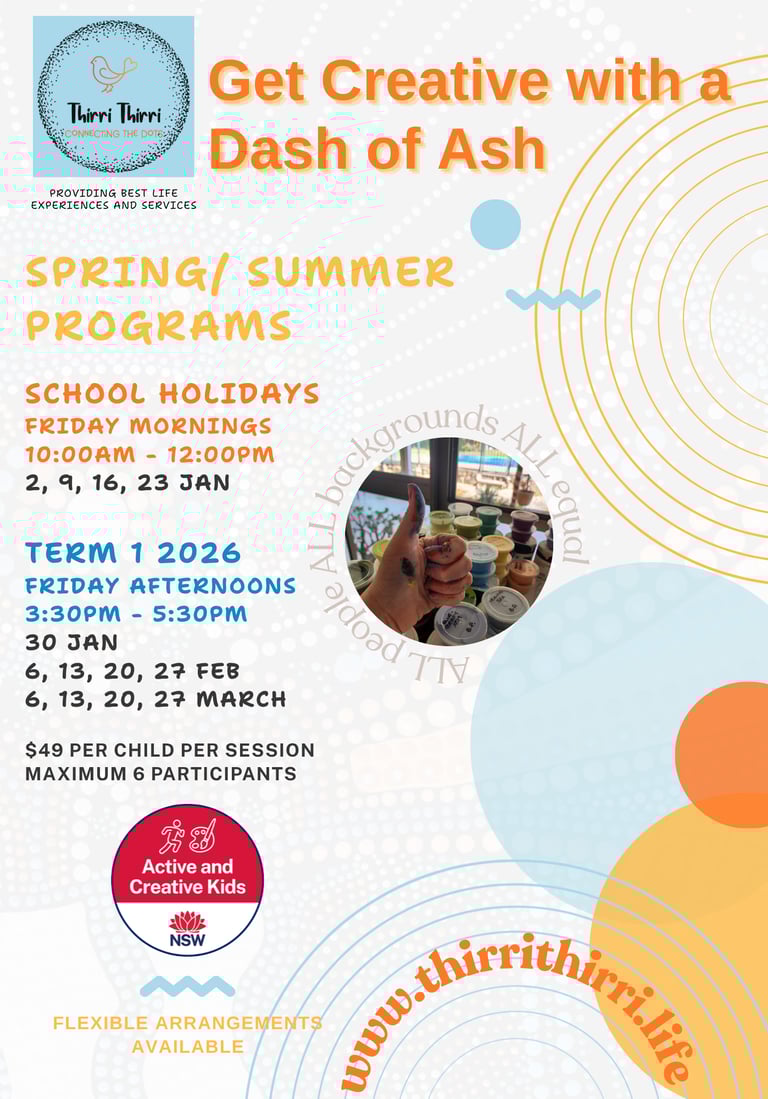 Thirri Thirri - Connecting The Dots', Artist, Ash, is offering art and self-discovery workshops. Available to schools, workplaces, and other private events. Explore how to meet your teams wellbeing needs through self-awareness in a fun, inclusive environment.
